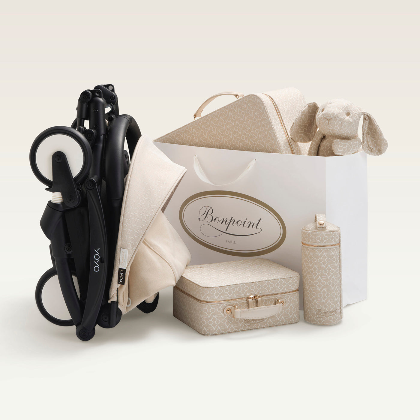 L’Iconique is part of Bonpoint’s permanent collection and is available in a range of pieces, from suitcases and water bottle holders to plushies. A line of baby essentials perfectly coordinated with YOYO Bonpoint Beige, ensuring harmonious coordination and effortless style.